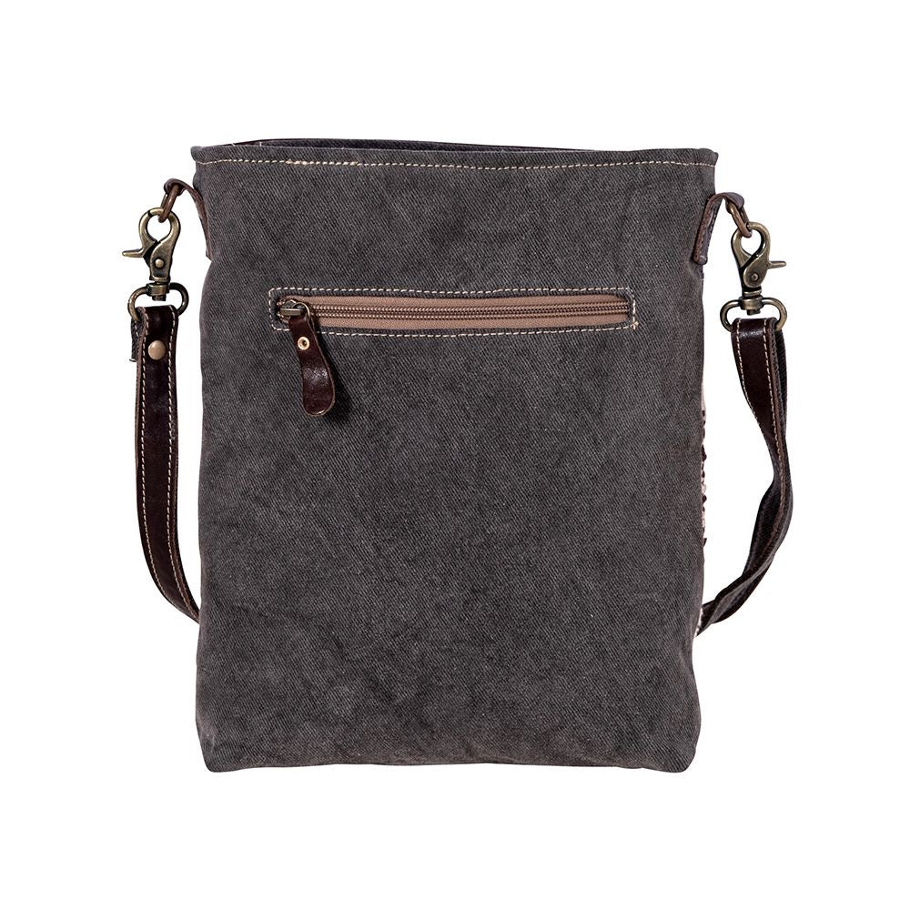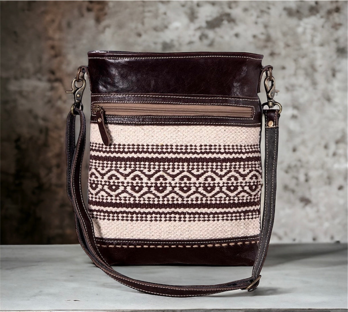 This gorgeous bag features a panel of upcycled woven rug with an beautiful tribal pattern. Front panel accents in deep chocolate leather live in harmony with the charcoal grey woven canvas back. Zippered front and back pockets add handy convenience. Zipper closed top. Shoulder strap in matching leather. A delightful bag!
