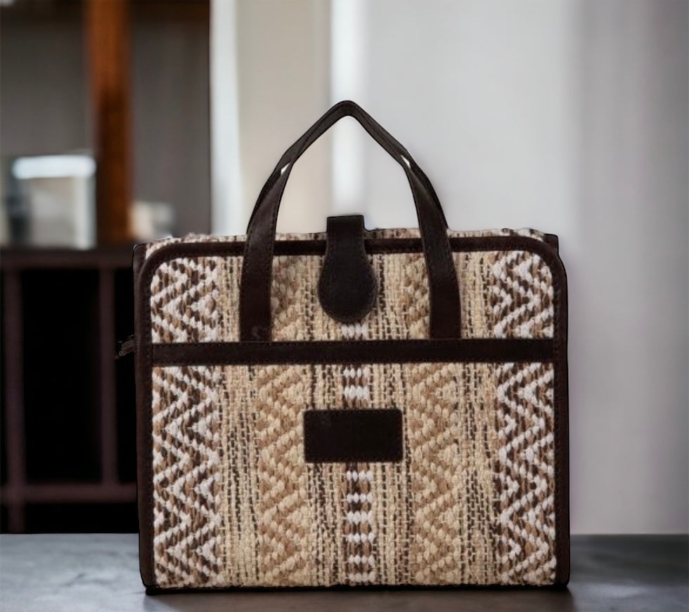This amazing case features the striking upcycled woven rug that’s the signature of this collection, with beautiful hues of sandstone, corn tassel, ivory and brown. Leather accents complete the look. Inside, you’ll find handy zippered compartments, along with a hook for hanging while you’re on the go. Snap closure.