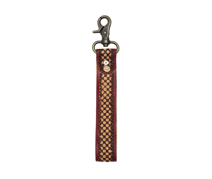 A leather wristlet with a maroon border owning a pattern which is full of twists and turns. The classic colour combo makes it a me-too product.