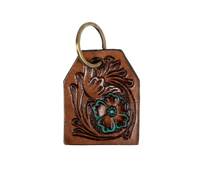 Just imagine lovely blooms at the edge of a desert creek… the depiction on this hand-tooled leather keychain seems to take us there. Includes standard key ring.