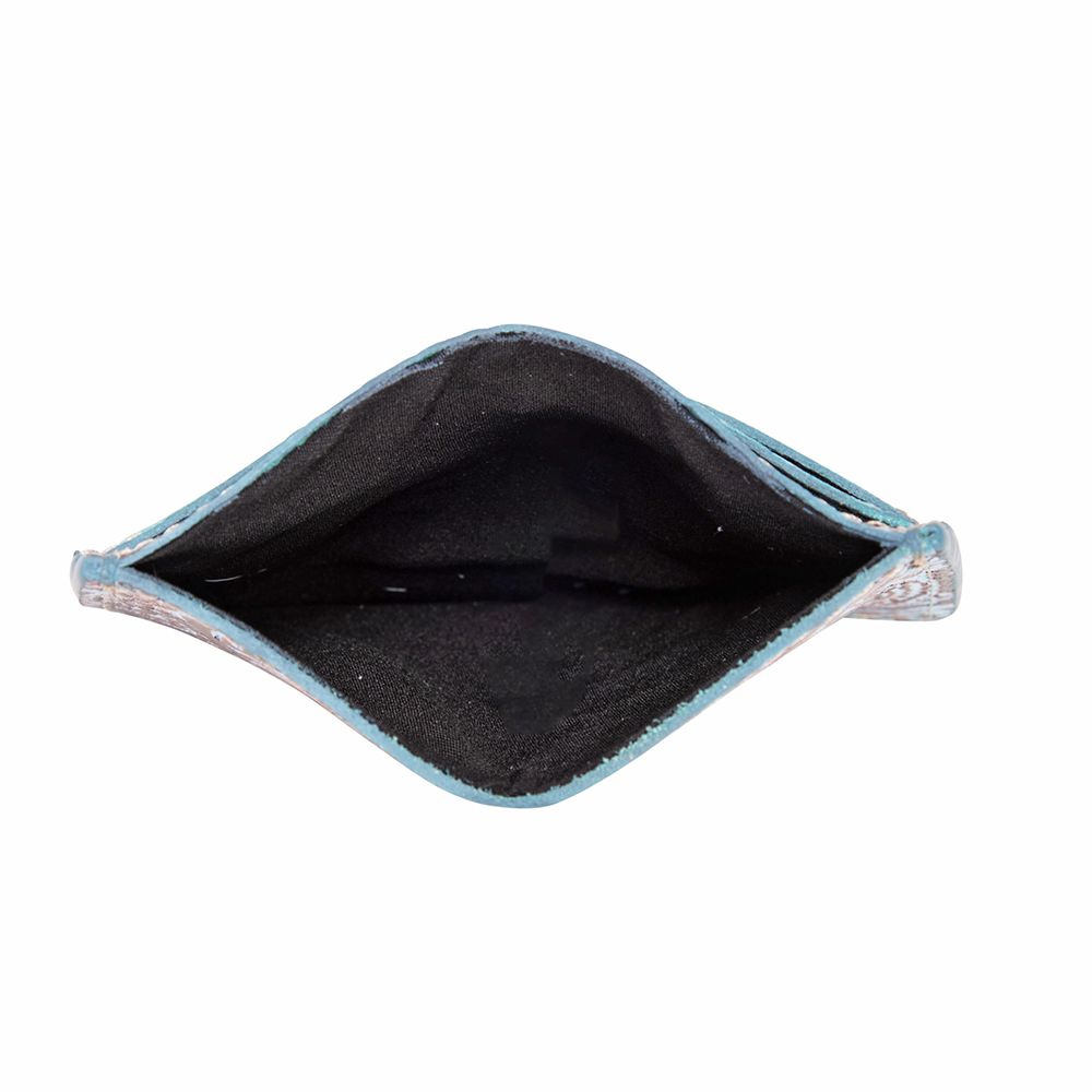 This striking card case from our Delilah Creek collection features gorgeous hand-tooled leather in a classic prairie desert design. The rich Southwest turquoise colour is alluring and stylish. Several slots carry your essentials while you’re on the go.