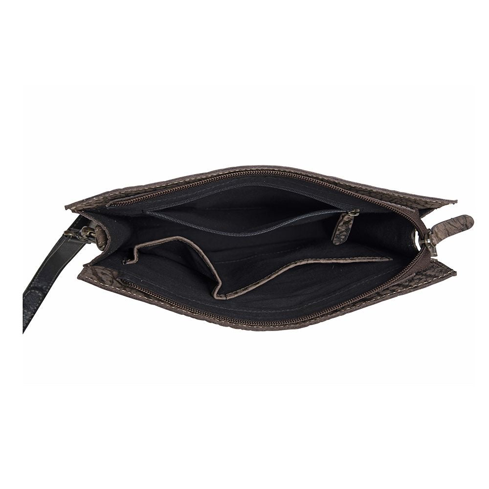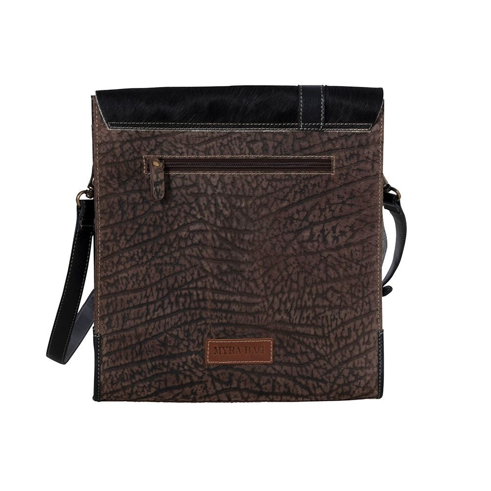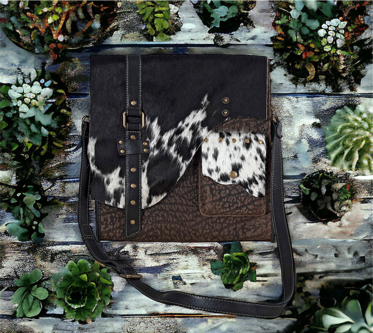 Gorgeous stamped, aged leather in bourbon chocolate and hair-on hide make a for an amazing combination. This beautiful bag include a spacious interior with a zippered pocket. The front includes a wonderful asymmetrical flap and front pocket. The reverse is a luxurious chocolate brown patterned leather with zippered pocket. Zipper-close top with removable, adjustable leather shoulder strap. A beautiful bag!