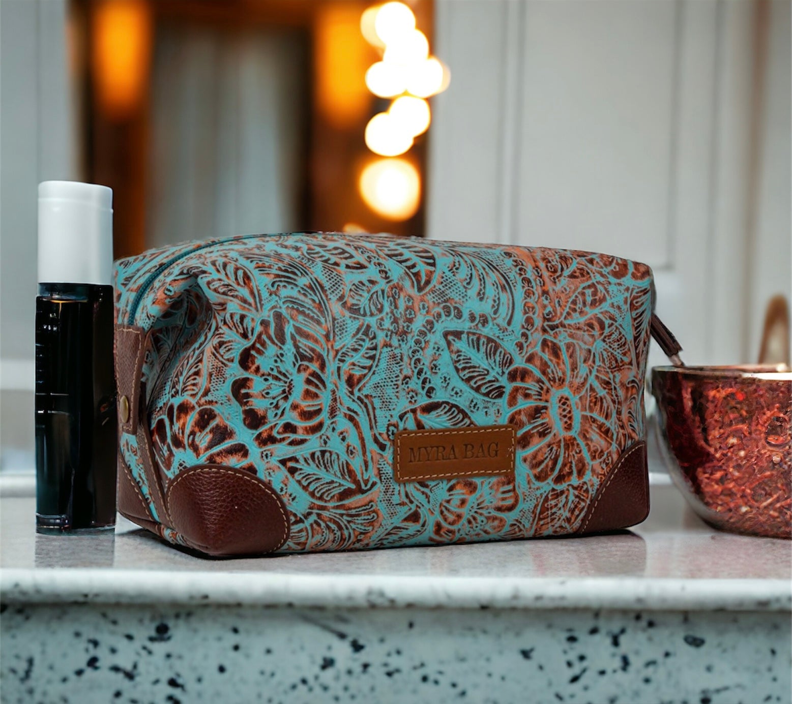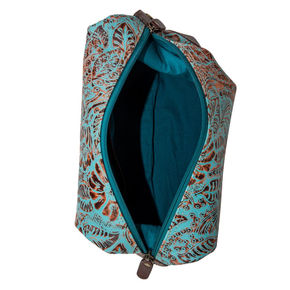 This beautiful toiletries bag features turquoise hand-tooled leather with corner leather accents. The roomy interior will hold your items securely with the zipper-close top. A beautiful and stylish accessory!