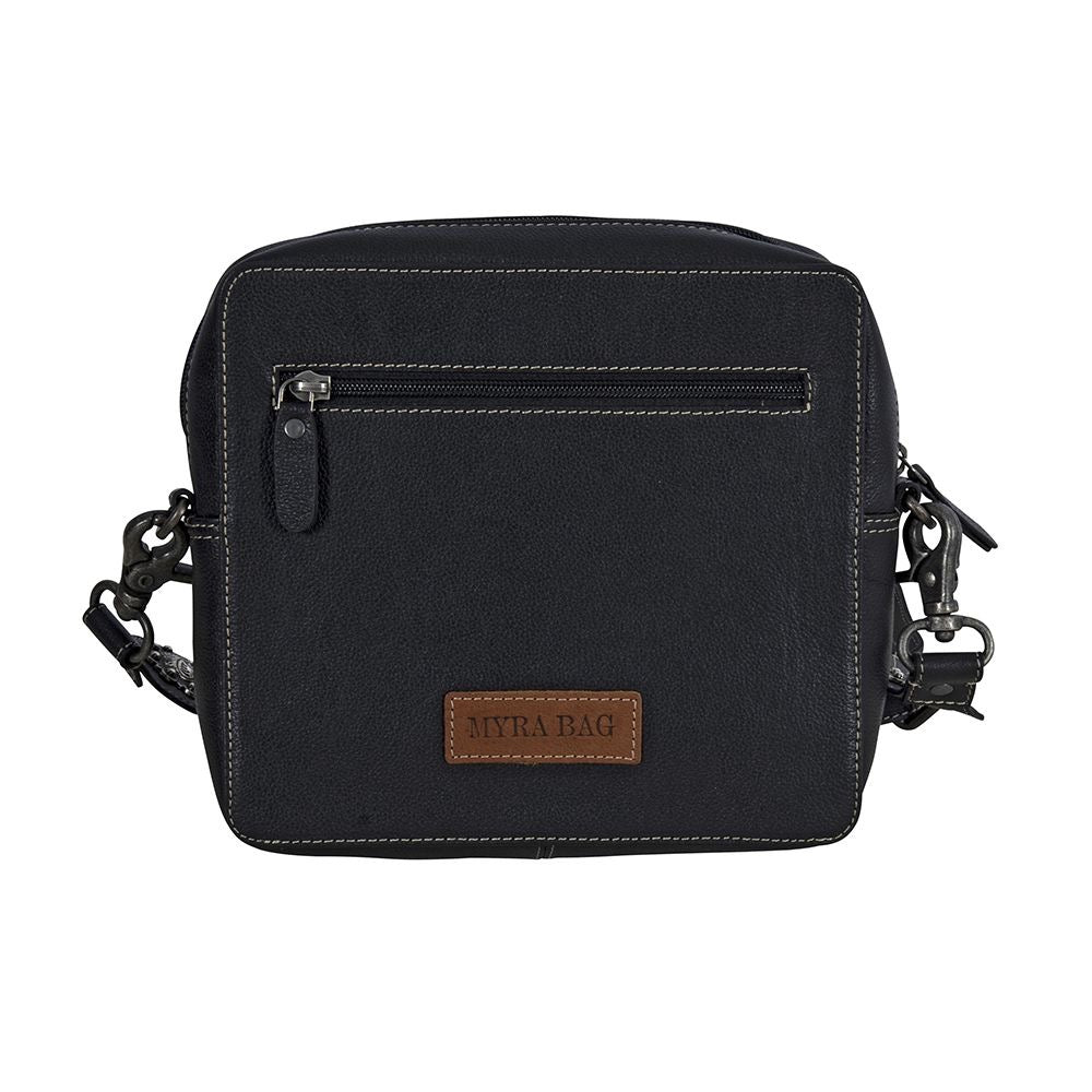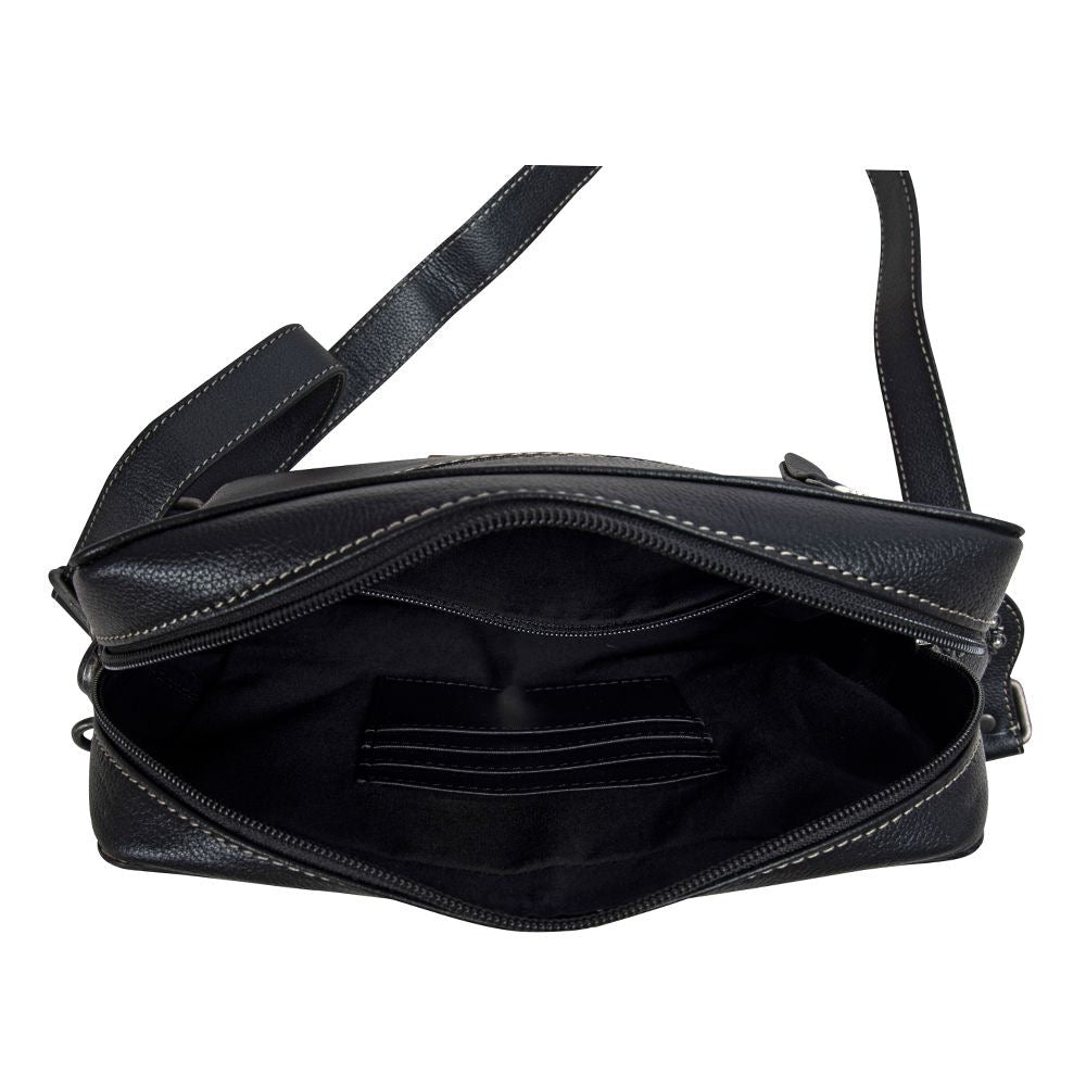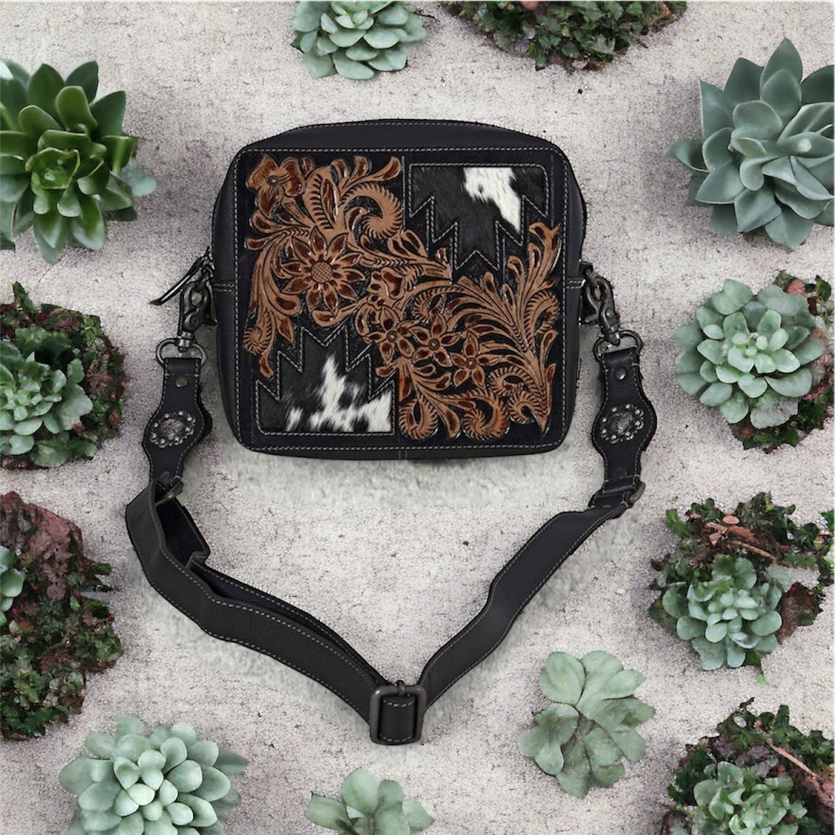 A unique design and Southwestern flair make this bag simply stunning! The front features hair-on hide beautifully framed by hand-tooled leather in a timeless “scrolled foliage” motif. Special accents of hair-on hide, in a special Southwest-inspired stitching, complete the wonderful look. The sides and back are a luxurious rich chocolate leather. The back also includes an added zippered pocket. Matching leather shoulder strap is fully adjustable, removable and features special silver-tone and faux turquoise accents. A superb bag for all occasions!