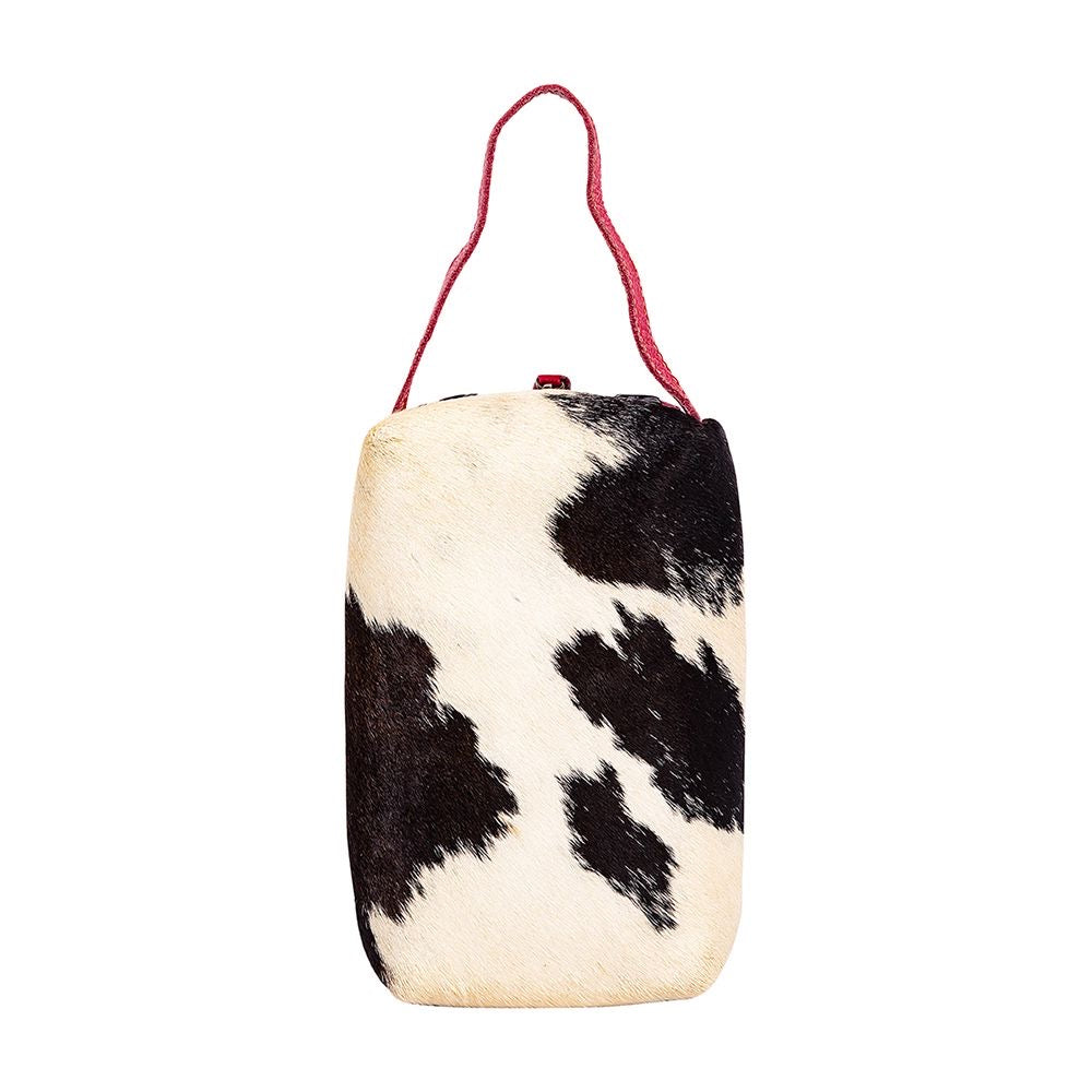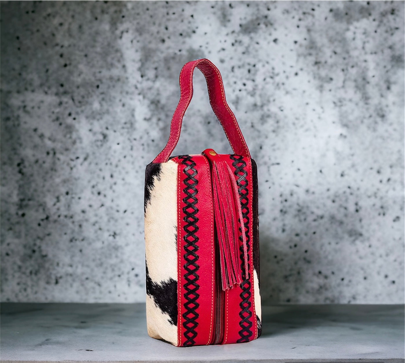 Beautiful hair-on hide and luscious red leather bring eye-catching style to this bag. The top is covered in red leather with special ebony stitching. Matching leather carrying handle, a roomy interior, and zipper-close top with matching tassel complete the look.
