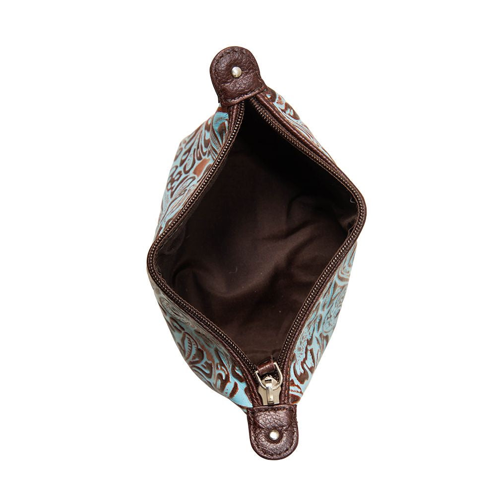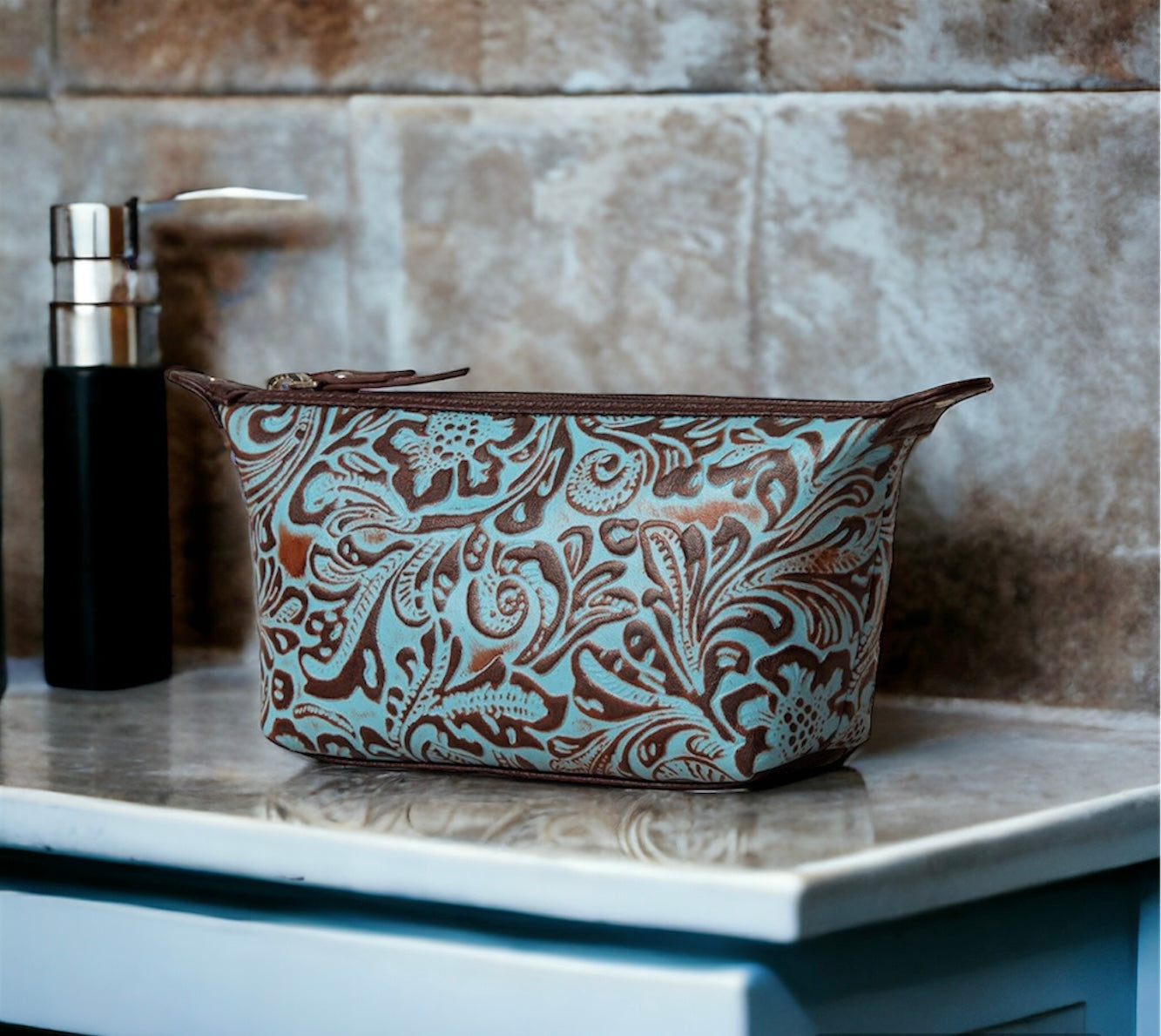 This beautiful toiletries bag features turquoise hand-tooled leather, the signature of our Marta collection. The roomy interior will hold your items securely with the zipper-close top.
