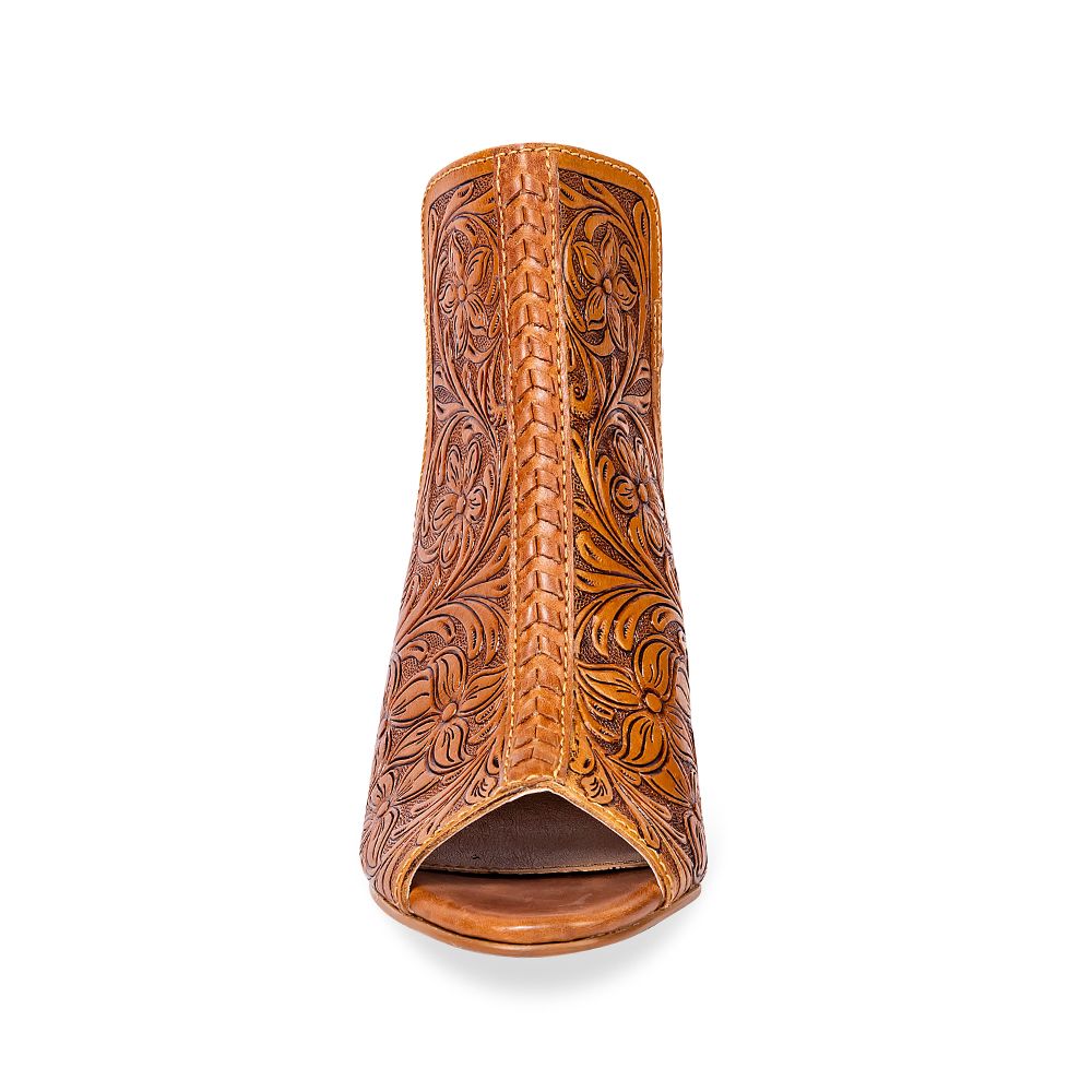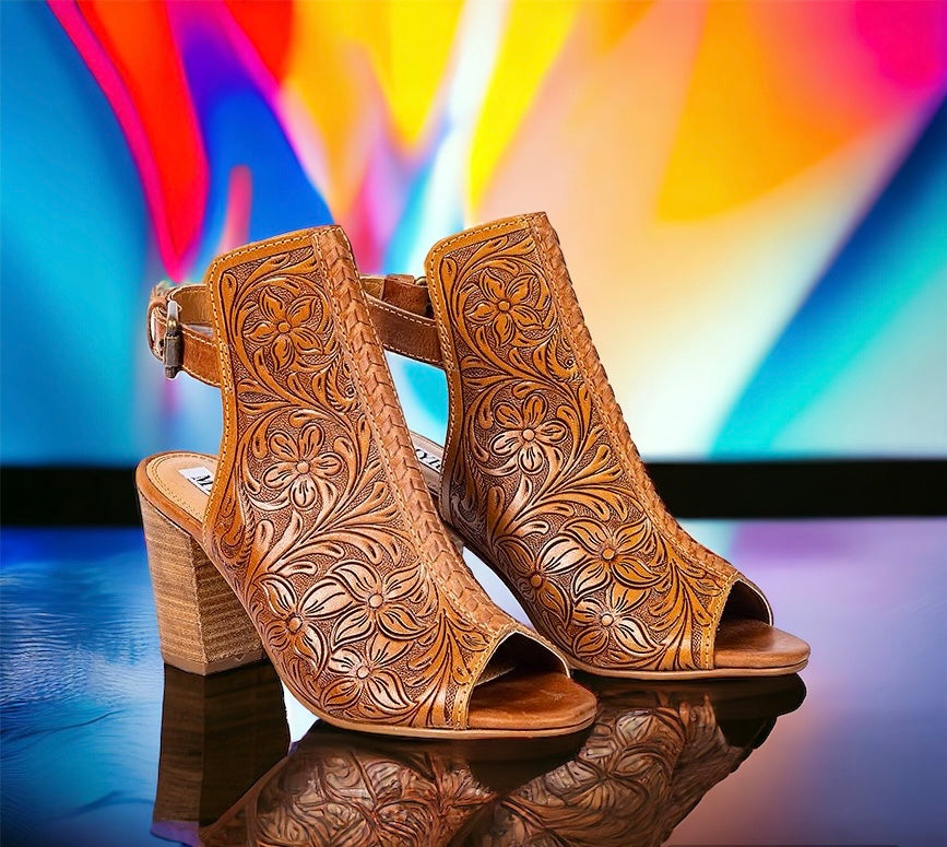 Whenever you slip on these incredible heels, you’ll feel amazing. A rich Western motif is lovingly crafted into the leather, all with a braided centre seam. The matching heel strap features an antiqued brass buckle for just the right finish.