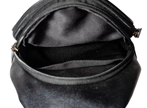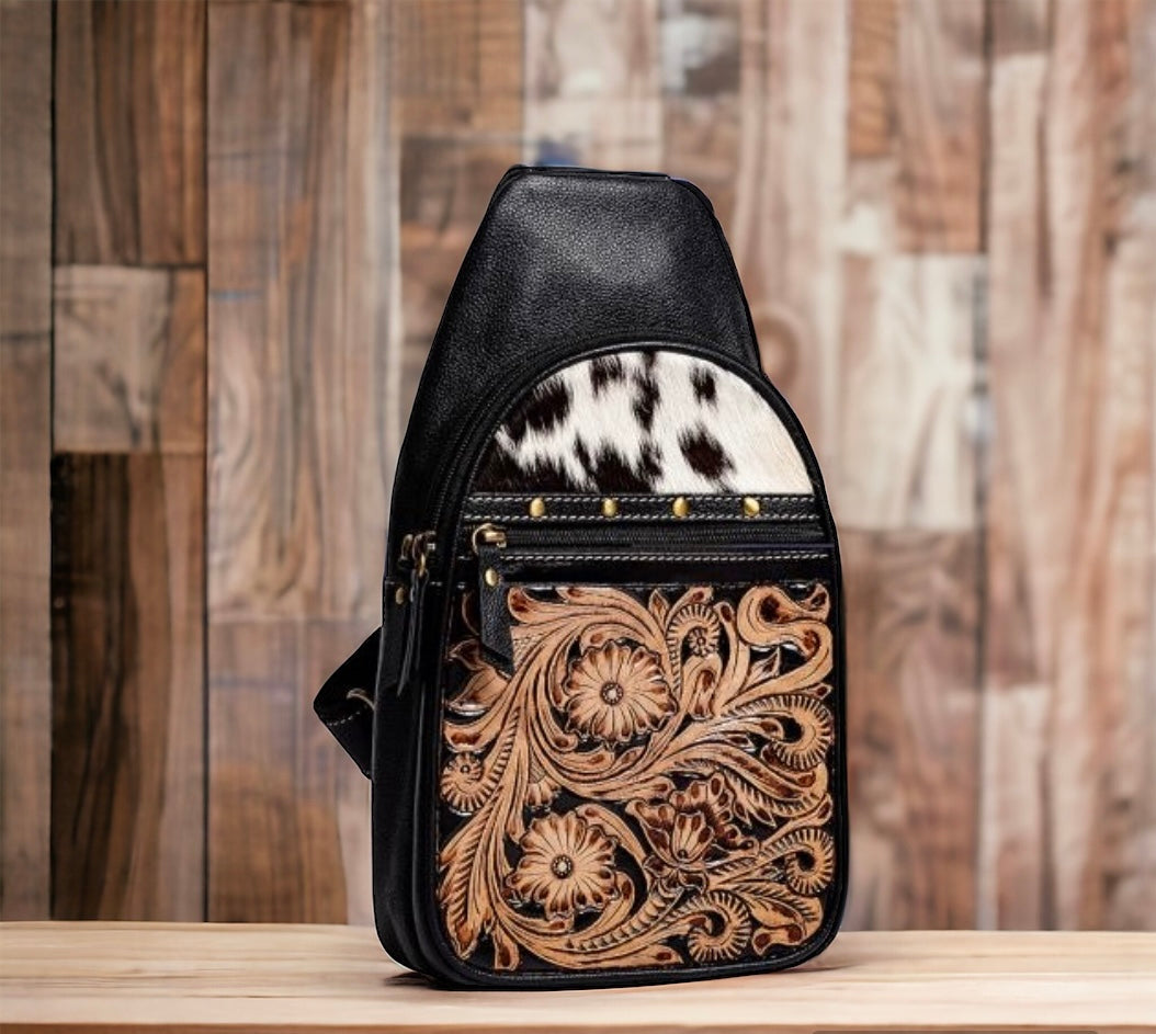 This exquisite sling backpack combines elements of leather and hair-on hide to perfection! It features gorgeous ebony leather, and front panels of hair-on hide, and glorious hand-tooled leather. You can wear it on your side, or on your back or front, as you need. Numerous zippered compartments add convenience when you're on the go. Comfortable, adjustable shoulder strap is duo-tone canvas and and leather.