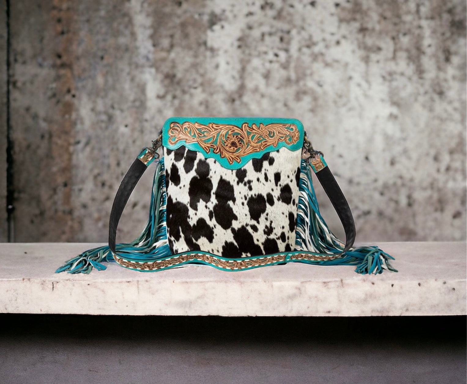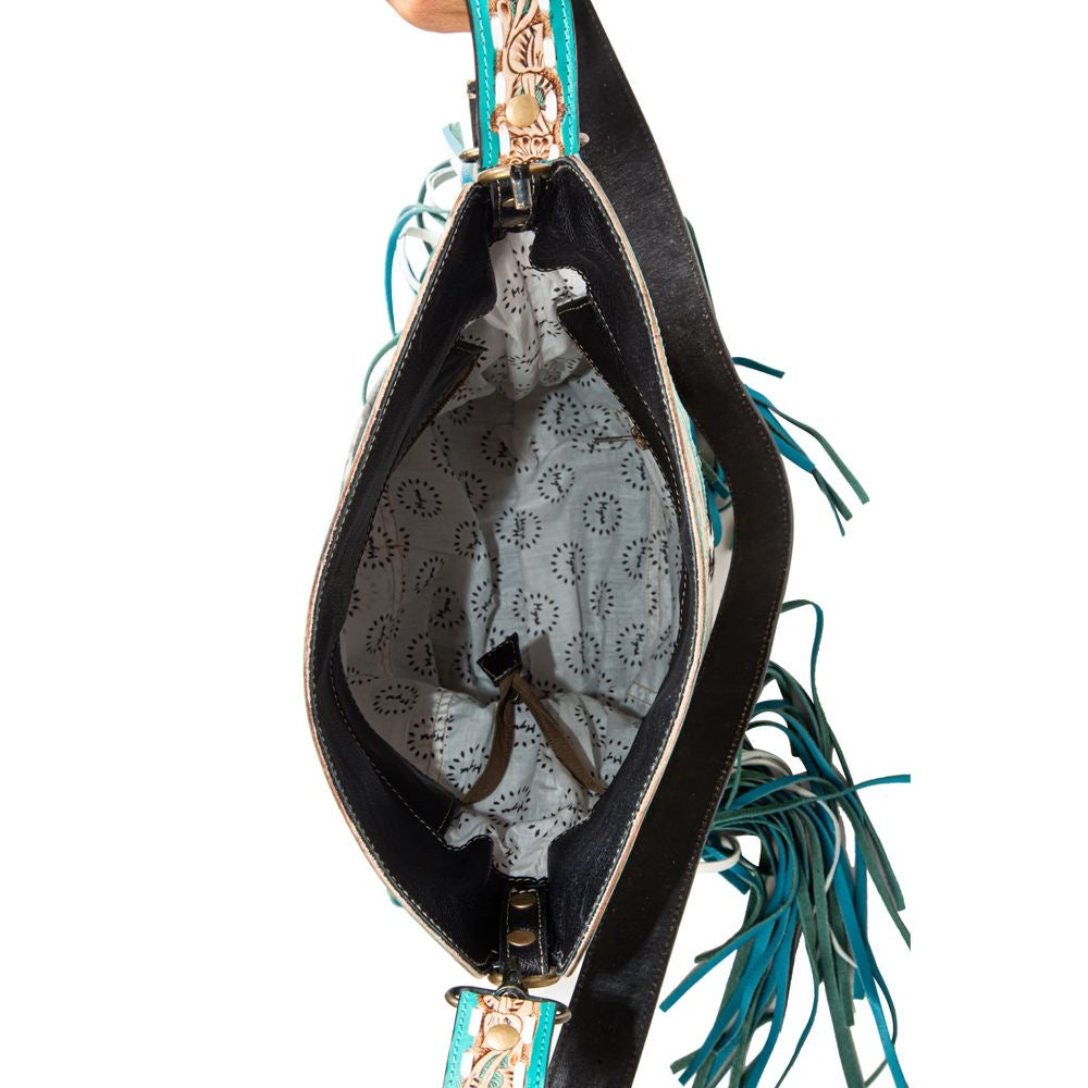 This marvellous bag offers so much! Both the front and the back feature a graceful top panel of hand-tooled leather, accented with a vibrant teal colour. Gorgeous hair-on hide and side leather fringe complete the stunning look. The interior features a zippered pocket and zipper close top. The removable, adjustable leather shoulder strap is also hand-tooled to match. An incredible bag!