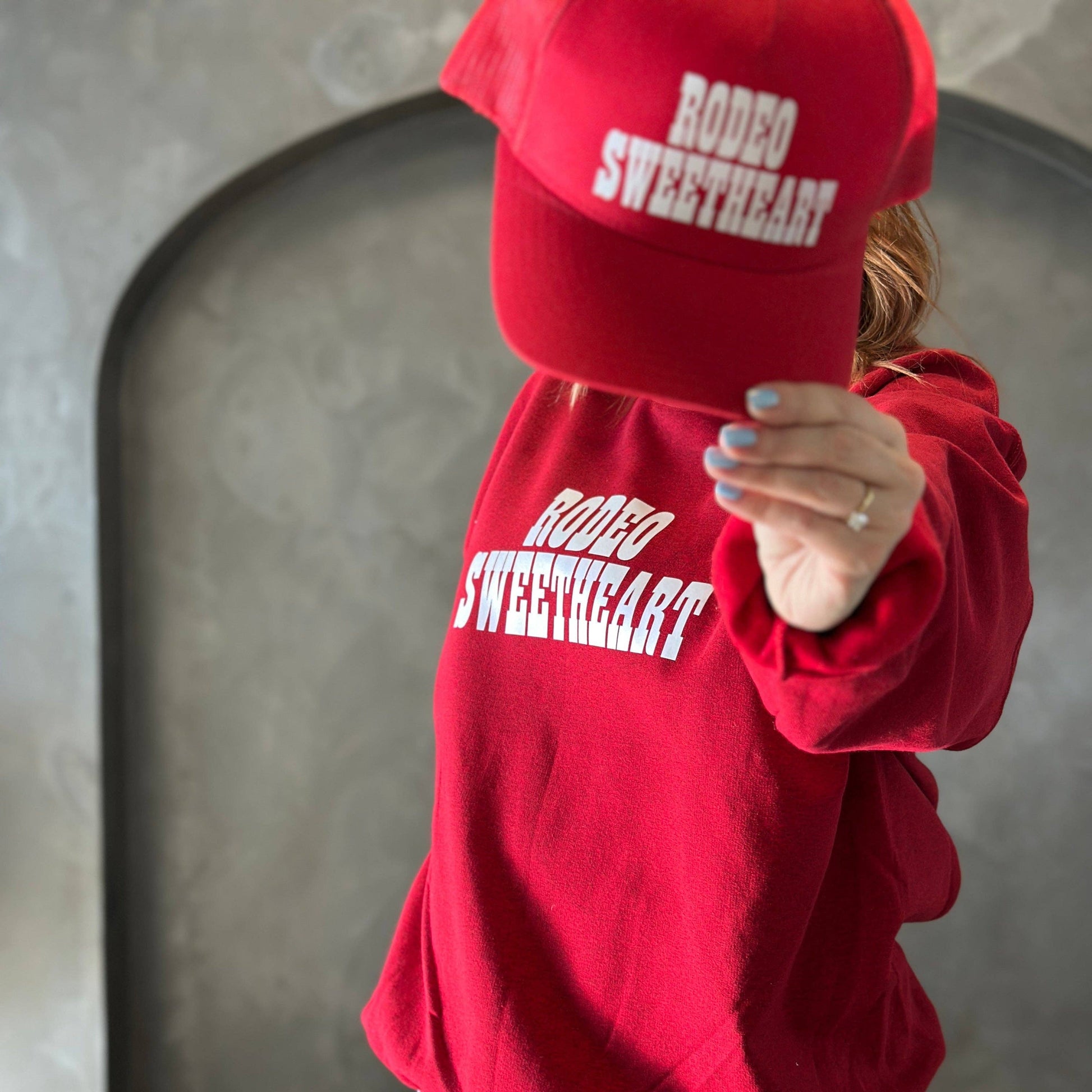 Show off your rodeo pride with our Red "Rodeo Sweetheart" Hat. Featuring bold white lettering and a breathable mesh back, this hat combines style with comfort. The adjustable snapback ensures a perfect fit for all-day wear, whether you’re cheering at the rodeo, heading to a country concert, or adding some Western flair to your everyday look. With its striking red color and fun "Rodeo Sweetheart" text, this hat is the perfect accessory for any rodeo lover or country enthusiast.
