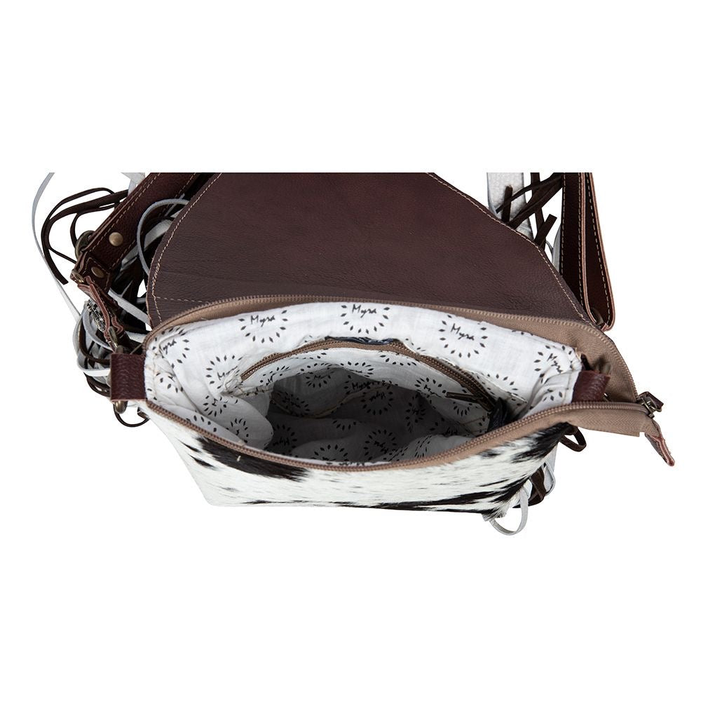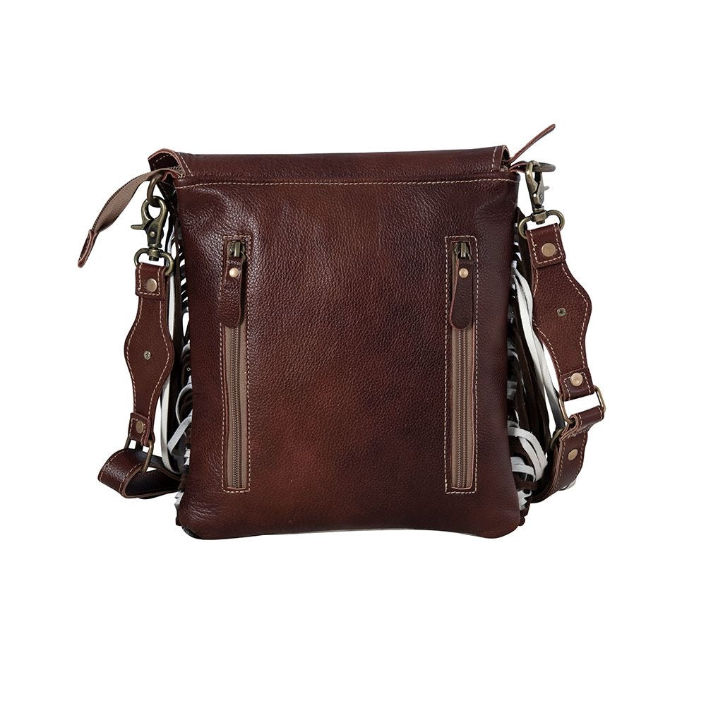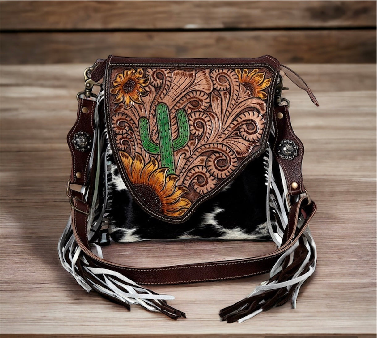 This striking bag features a stunning combination of designs elements! The asymmetrical top flap features amazing hand-tooled leather in a classic Southwest scene. Gorgeous hair-on hide forms the body, while the back is a lovely deep chocolate leather, complete with two zippered pockets. Black and white leather fringe grace each side. The interior features a zippered pocket and zipper close top. The matching detachable leather shoulder strap is fully adjustable and features special concho accents.