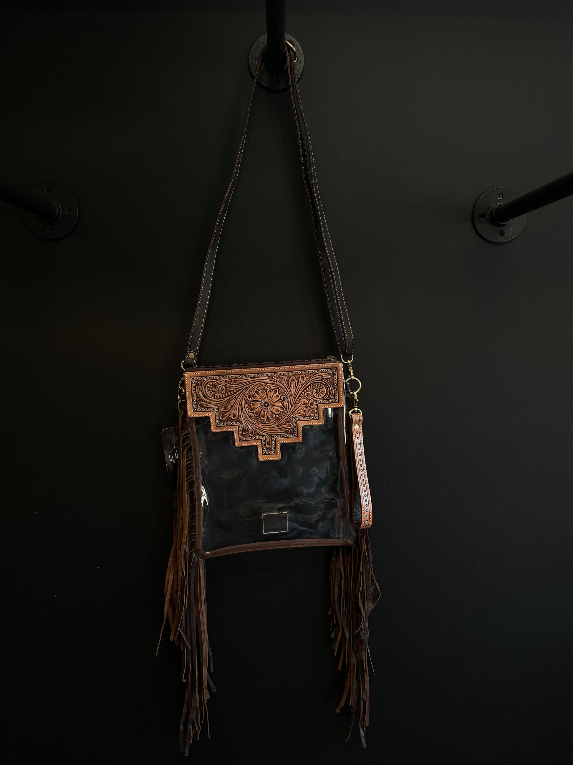 Turn heads while staying venue-ready with the Prairie Veil Clear Bag. The striking clear body is elevated by a bold hand-tooled leather flap in a rich western pattern, blending tradition with modern practicality. Flowing fringe on each side adds movement and personality, while the detachable strap offers versatile styling for any occasion.