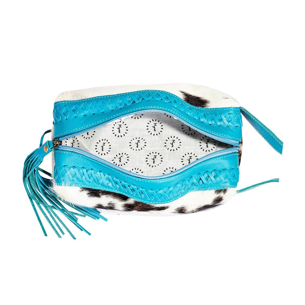 Alluring hair-on hide and striking blue leather bring amazing style to this bag. The top is covered in blue leather with special cross stitching. Matching leather carrying handle, a roomy interior, and zipper-close top with matching tassel complete a wonderful look.