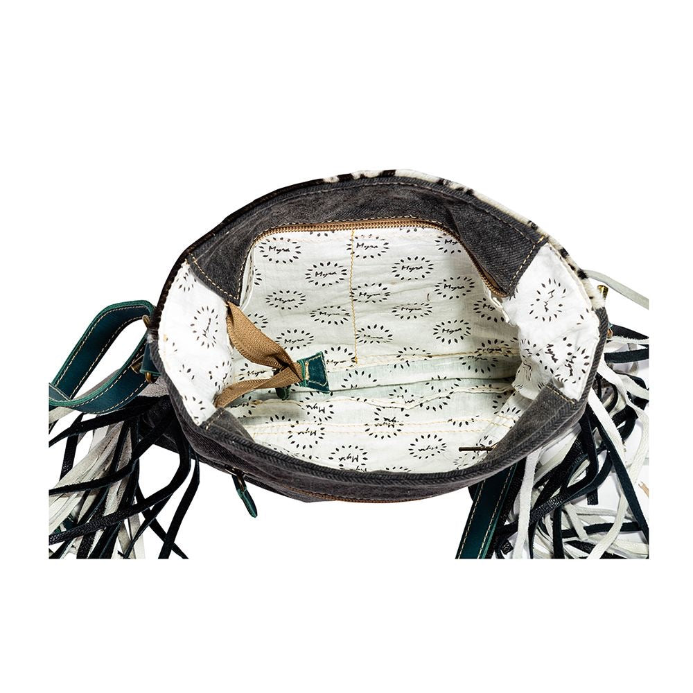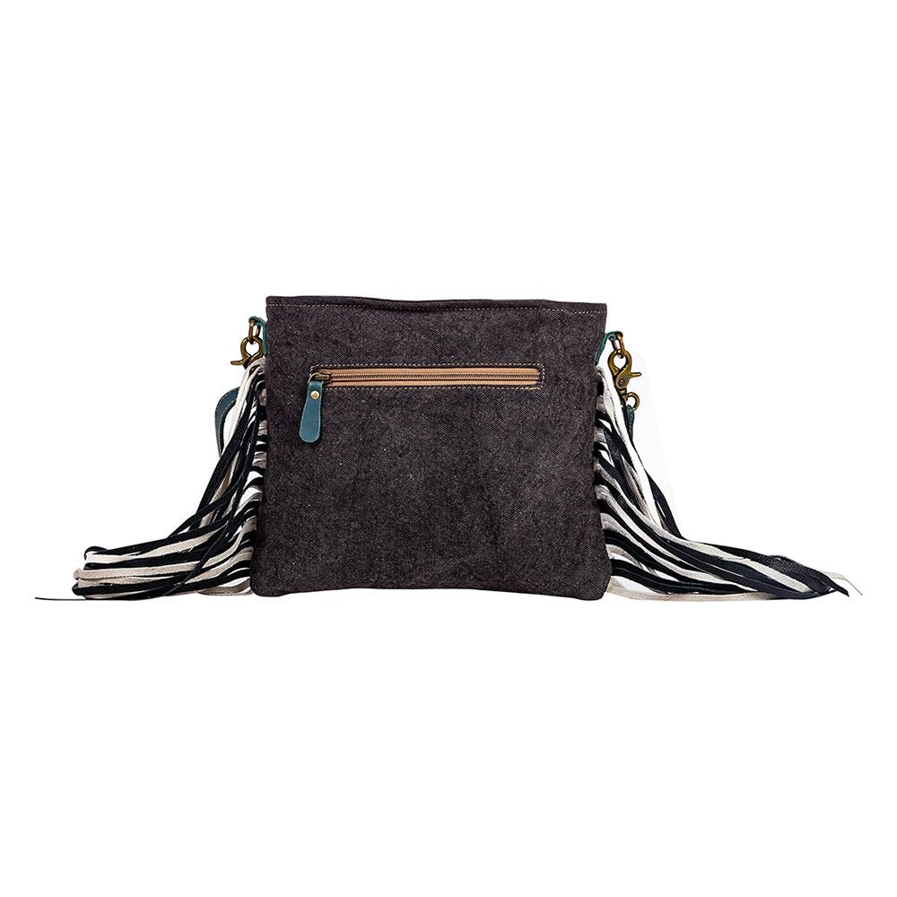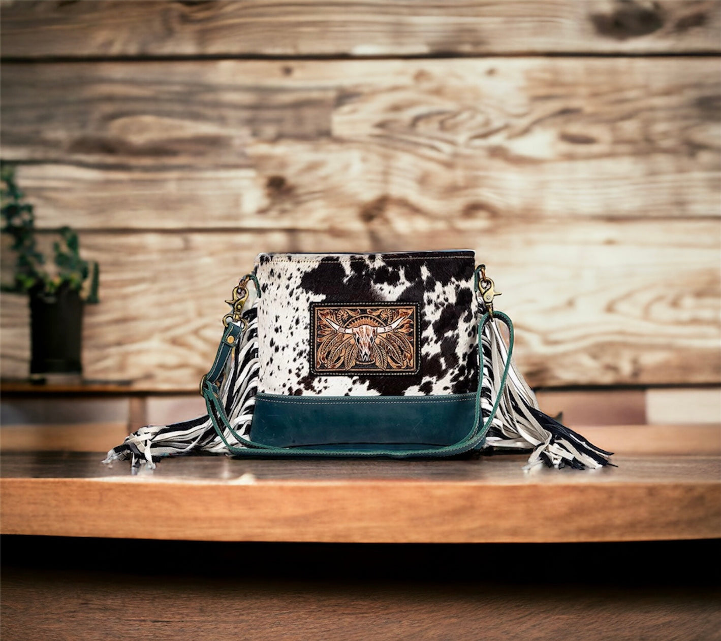 This bag is makes for a wonderful, glamorous presentation! The hand-tooled accent features the hallmark of our “Spirit of the Herd” design – a lone steer skull. It has beautiful hair-on hide, accented in a gorgeous deep teal blue. Duo-tone leather fringe drapes from each side. The ample interior that has a separate pocket and zipper-close top. The back is cloud grey woven canvas and has an zippered pocket. The adjustable, removable leather shoulder strap in the beautiful matching leather. A truly unique addition to your wardrobe!