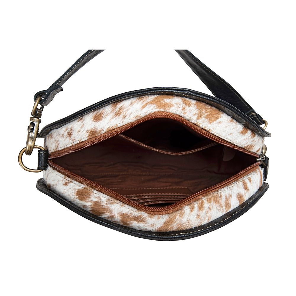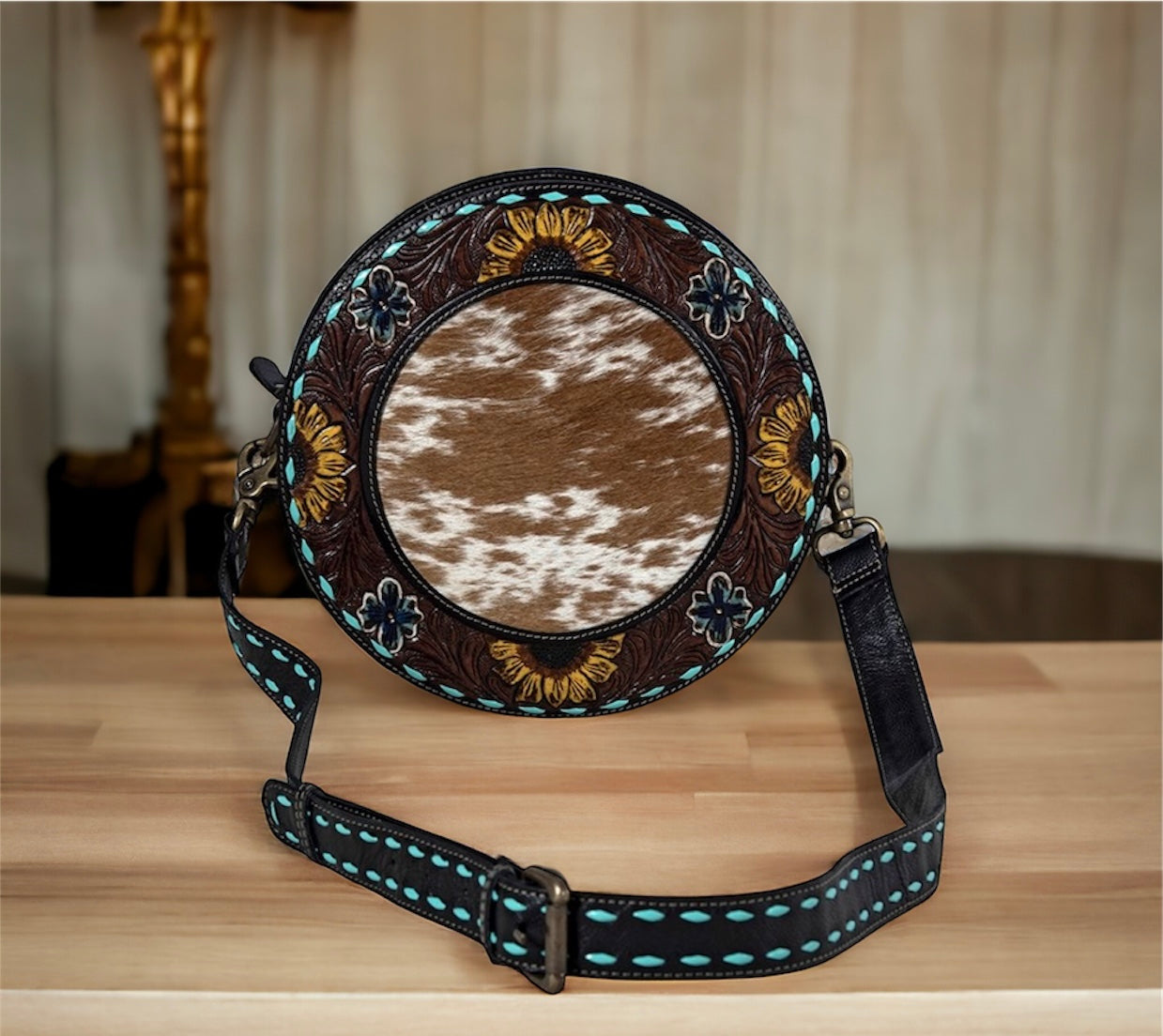This round bag is amazing, with hair-on hide encircled by beautiful hand-tooled leather with remarkable turquoise stitching. The scene of desert sunflowers and blooms is serene and eye-catching. The back is a striking high-grain leather in deep bourbon chocolate, with a handy zippered pocket. Zipper close top. The adjustable, removable shoulder strap is also detailed in the same turquoise stitching at the front.