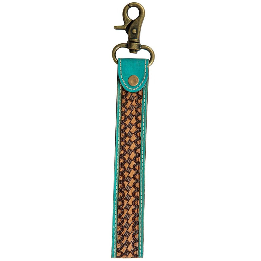 With striking colours of sandstone and Southwestern teal, this leather wristlet offers an intriguing pattern that delights the eye. You’ll enjoy it every time you pick it up!