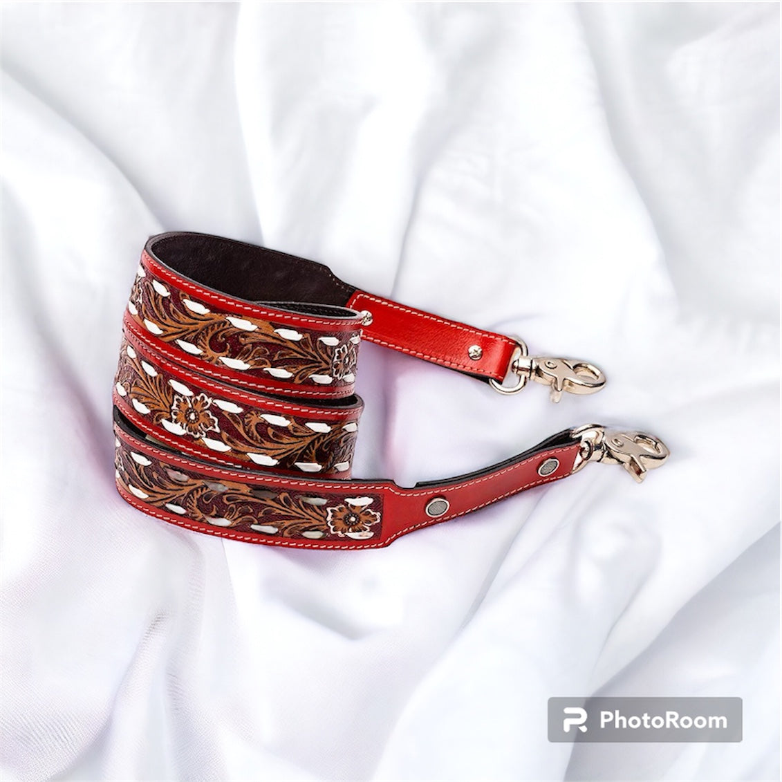 Eye-catching and beautiful is an understatement for this amazing strap! Gorgeous red leather and detailed scrollwork and stitching accents combine perfectly.