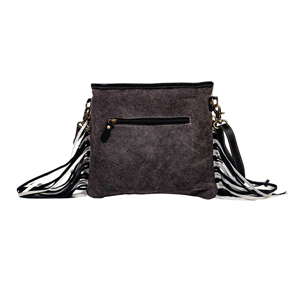 This gorgeous bag features a striking front panel of woven upcycled rug, accented by a top panel and corners of croc pattern leather. Two-tone leather fringe drapes from both sides for just the right stylish touch. Roomy interior features a zipper-close top. Reverse is dark woven canvas with an extra zippered pocket. Matching leather adjustable shoulder strap is detachable and adds convenience and utility.