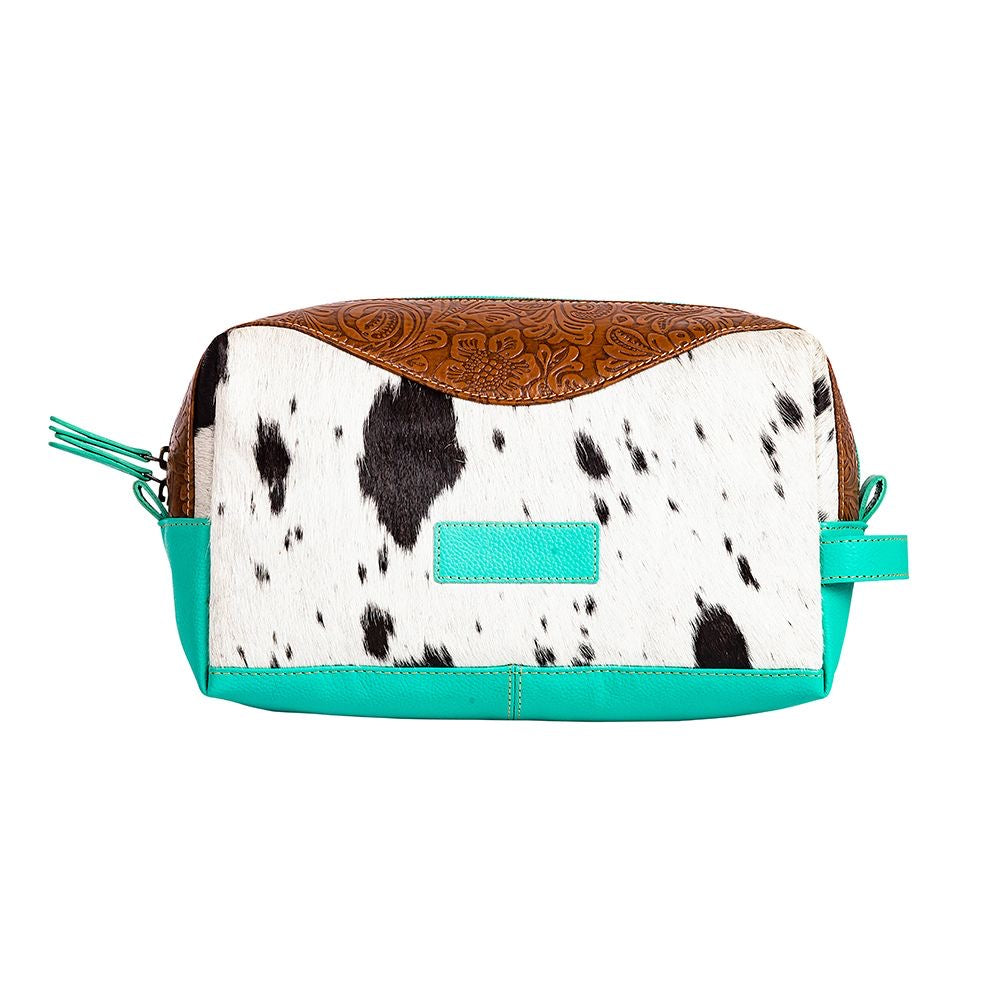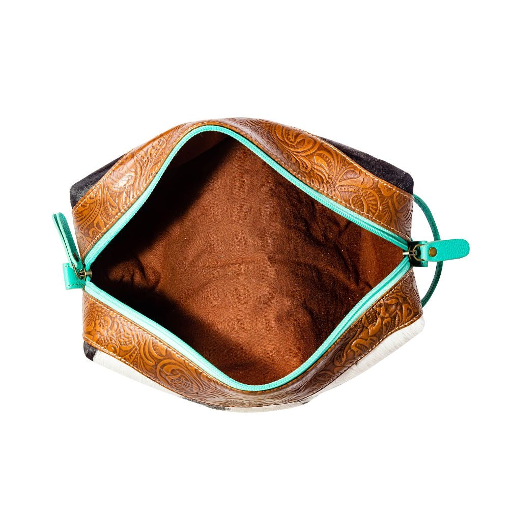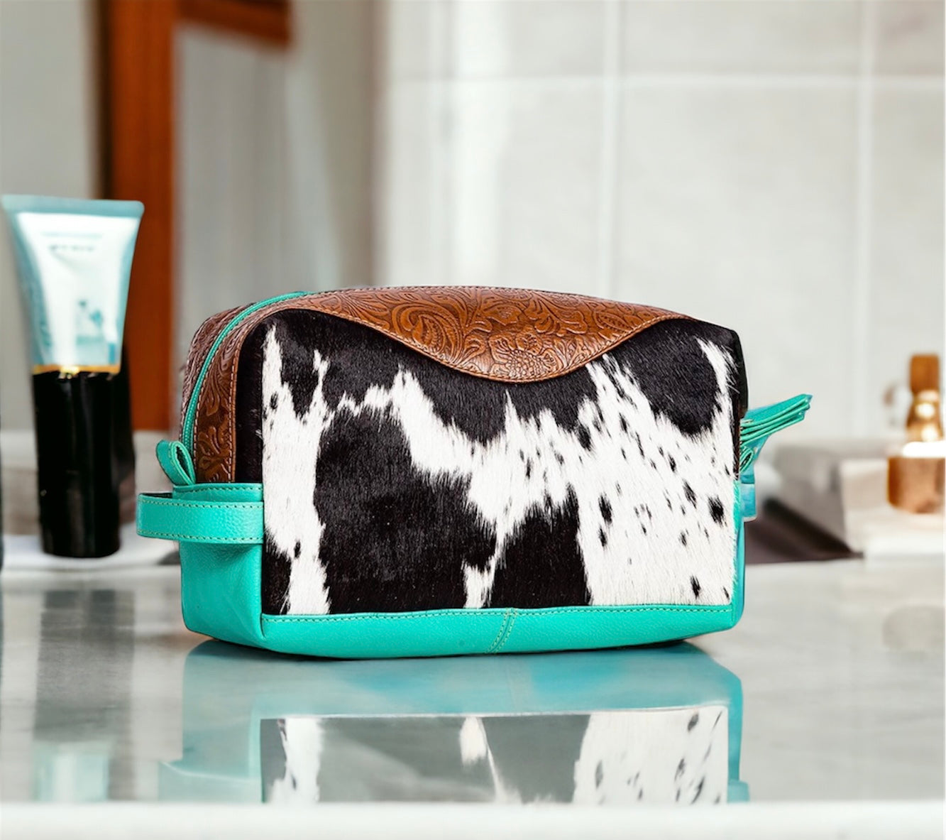 This amazing toiletries bag features beautiful hair-on hide and gorgeous hand-tooled leather, all embraced by vivid turquoise leather. The roomy interior will hold your items securely with the zipper-close top.