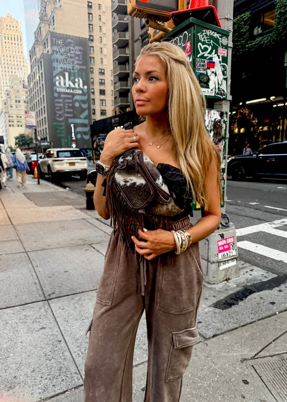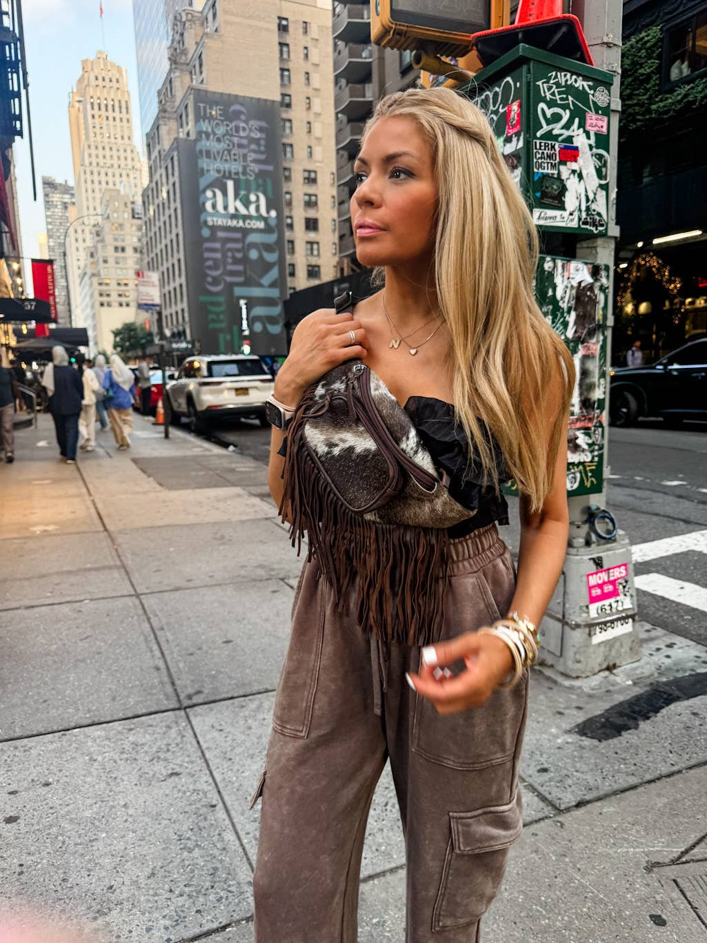 The Dusty Trails Fanny Pack is the perfect mix of western charm and everyday practicality. Crafted with genuine hair-on hide, each pack is one-of-a-kind with natural markings that make it unique. The front is accented with flowing fringe for added style, while the spacious zippered pouch opens wide for easy access to your essentials. With its adjustable strap, you can wear it comfortably around your waist or sling it crossbody for hands-free convenience.